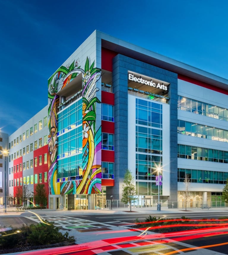 The Creative Village in downtown Orlando is a hub that includes The Monroe cafe, the UCF/Valencia Downtown Campus, Electronic Arts's Orlando Studio, and the Luminary Green park, along with various residential buildings and open merchants.